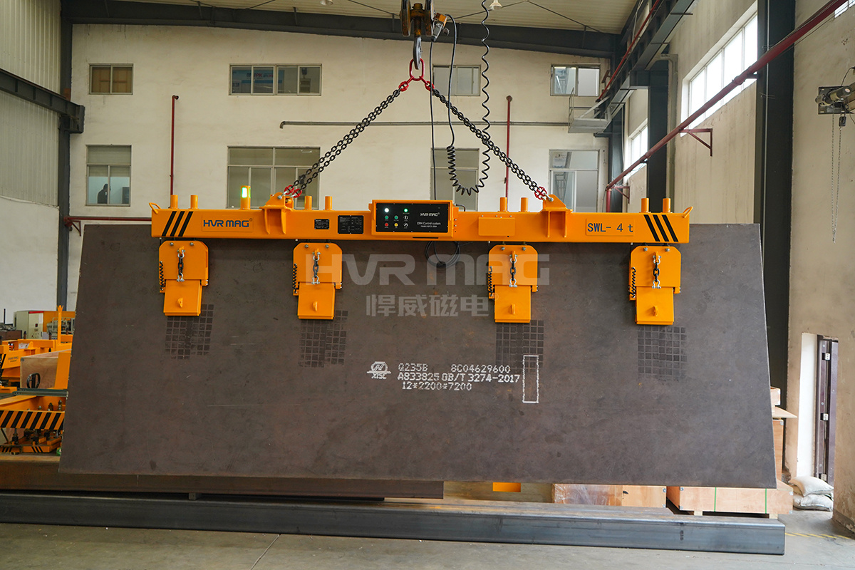 以下是悍威磁電最新生產(chǎn)的一套出口美國的側(cè)吊型鋼板吊磁力吊具試吊圖,額定起重能力為6噸,采用了6臺電永磁鐵聯(lián)合吊運的方式,幫助終端用戶實現(xiàn)對鋼板安全平穩(wěn)高效的搬運,技術(shù)上已經(jīng)超過美國,處于技術(shù)領(lǐng)先水平