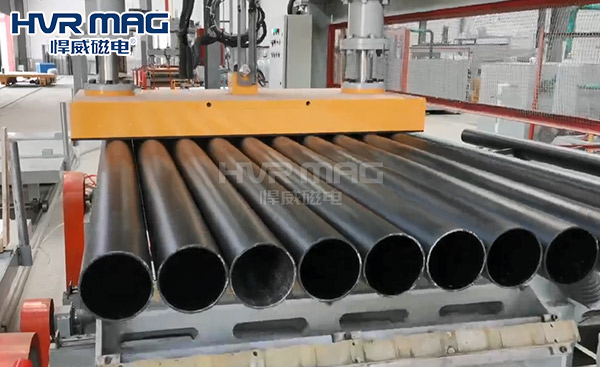 第三種工況的話就是中間會(huì)有一個(gè)圓管他的位置比其余幾根位置低數(shù)mm,悍威磁電則可通過(guò)充磁瞬間產(chǎn)生的磁場(chǎng)將其吸上來(lái)。以便達(dá)到可以搬運(yùn)的工況。