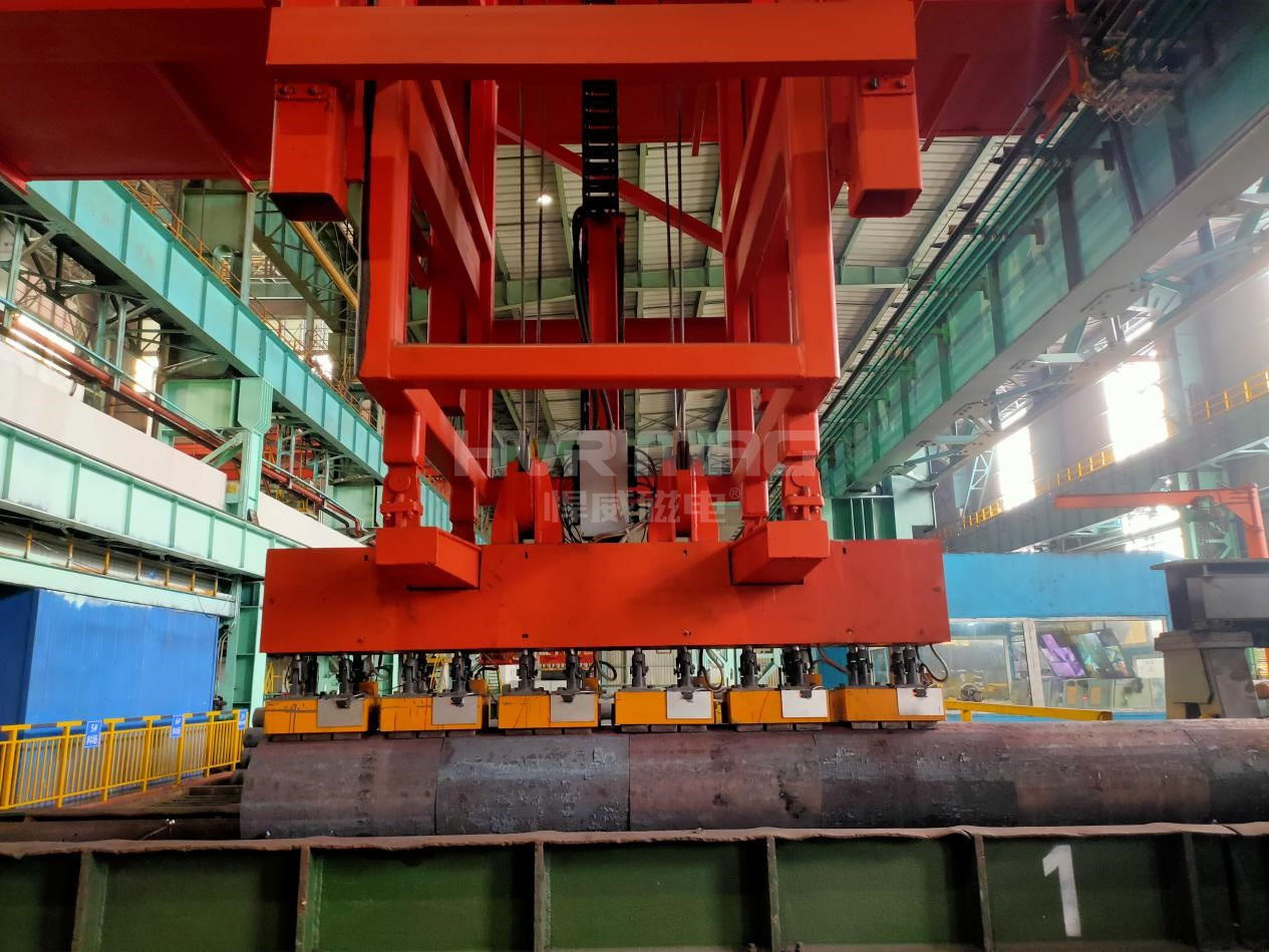下圖所示的智能起重機,配備了悍威磁電定制研發(fā)生產(chǎn)的6臺型號為HEPMSP-600P70S的電永磁鐵,通過配套的HEPC5-900A-T01電永磁控制器,實現(xiàn)單獨控制每臺磁鐵(PLC端輸出控制)。