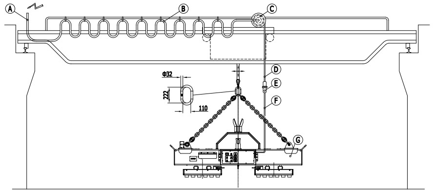 A:輸入電源 B:行車滑線 C:電纜卷筒 D:卷筒升降電纜 E:重載連接器 F:電永磁控制系統(tǒng)電源進線 G:橫梁