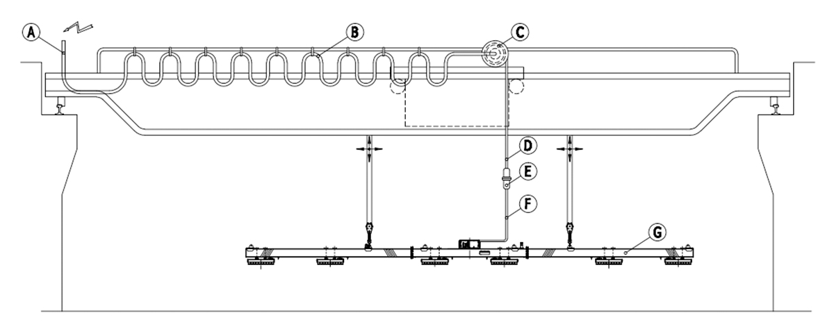 A:輸入電源 B:行車(chē)滑線 C:電纜卷筒 D:卷筒升降電纜 E:重載連接器 F:電永磁控制系統(tǒng)電源進(jìn)線 G:橫梁