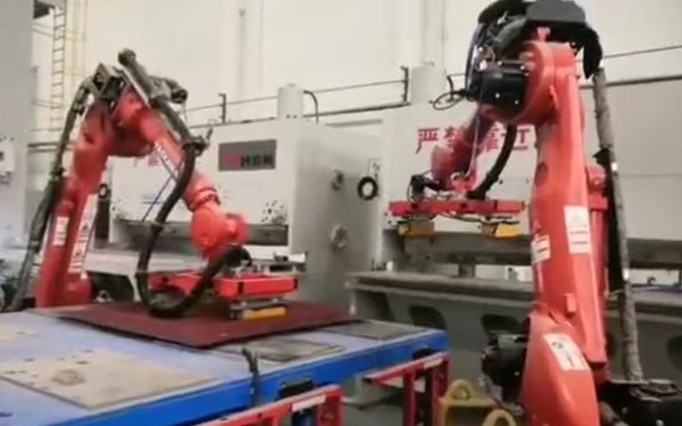 如圖所示,液壓閘式剪板機(jī)主要用于將板材或板材切成較小的部分,以準(zhǔn)備進(jìn)行其他加工。電磁機(jī)器人夾具負(fù)責(zé)將要切割的金屬零件裝載到剪切機(jī)中,然后卸載已切割的零件并將其傳送到碼垛線。