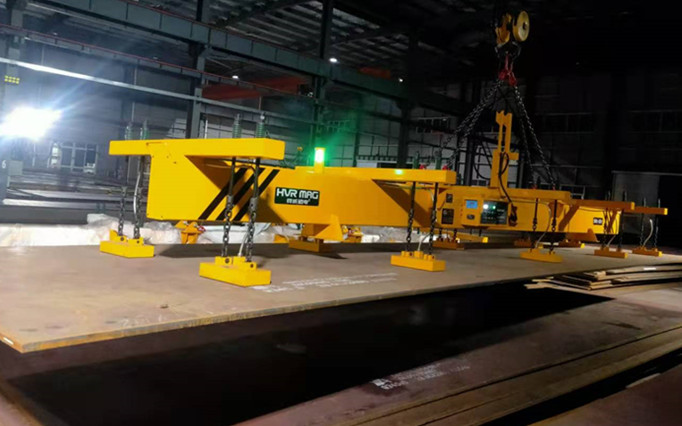 從圖片中可以看到,我們的客戶是河南省的一家鋼結(jié)構(gòu)公司,它利用我們的10噸工業(yè)吊裝磁鐵和橋式起重機,將一塊大的重型鋼板吊到鋼的預(yù)處理線上。這種類型的鉤下提升裝置在橫梁上裝有5組磁性模塊,適用于各種尺寸的板,因為磁性模塊可以針對各種尺寸的板進(jìn)行選擇性激活/停用。指示燈為綠色,表示磁體已成功磁化。